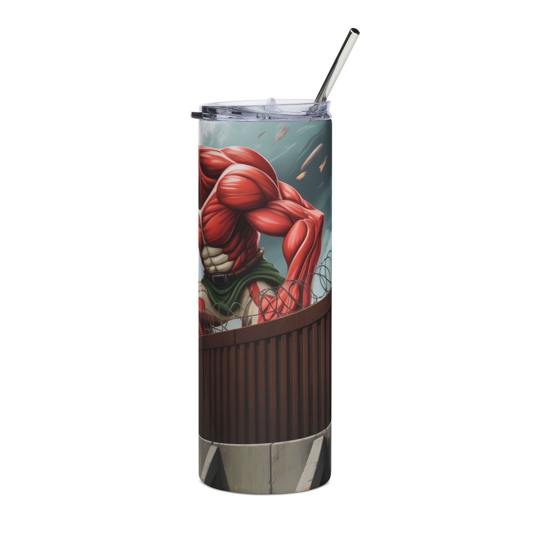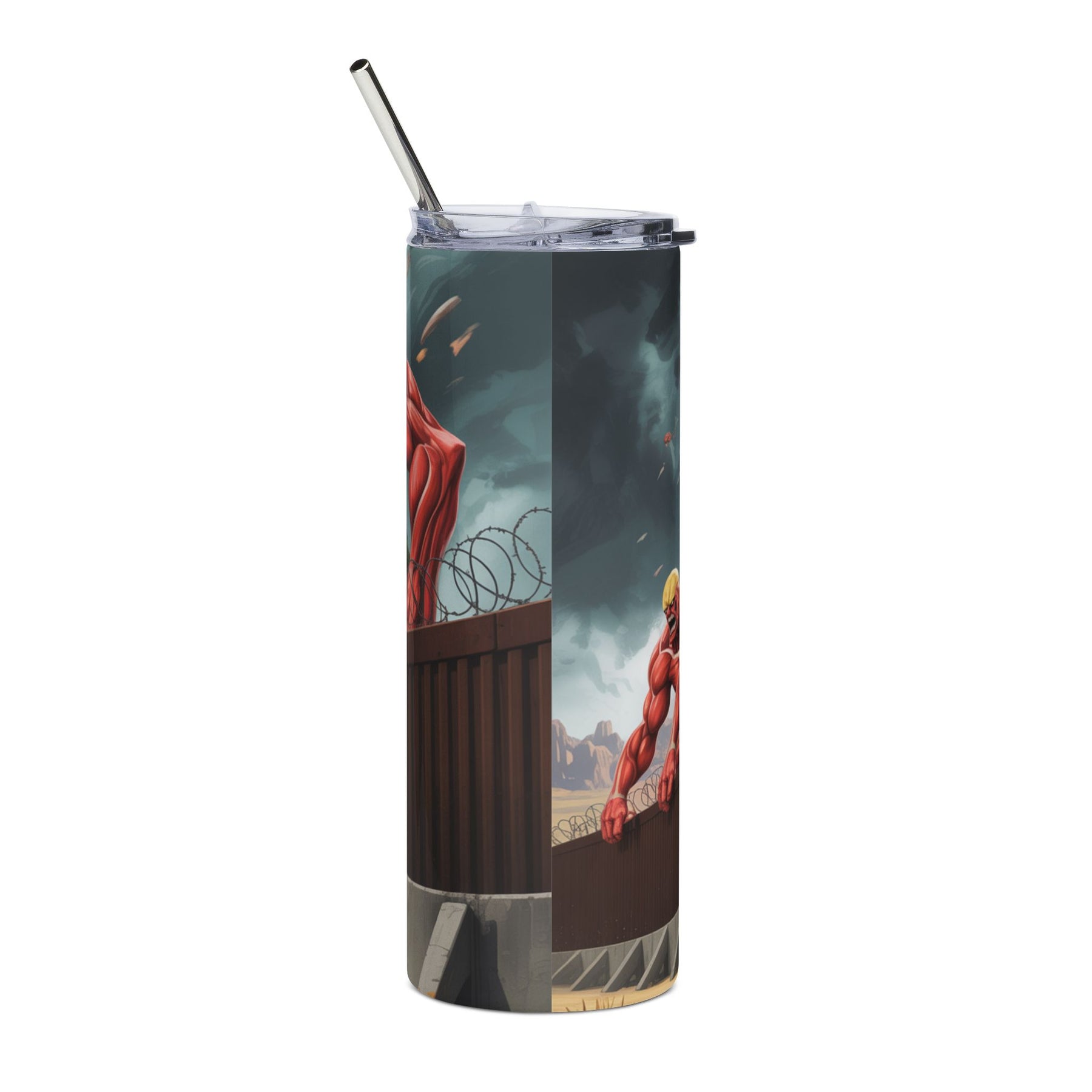 Bring your favorite sci-fi anime vibes to your daily hydration routine with this sleek 20oz tumbler. This Titan takeover of the U.S. border wall is sure to put a bit of fun in your coffee runs. Perfect for keeping your drinks at the ideal temperature while showcasing your love for Japanese-inspired futuristic art with a touch of U.S. fun. The durable stainless steel construction means this tumbler can handle whatever adventure you take it on, from morning coffee runs to late-night gaming sessions. Now your beverages can be as epic as your taste in anime.