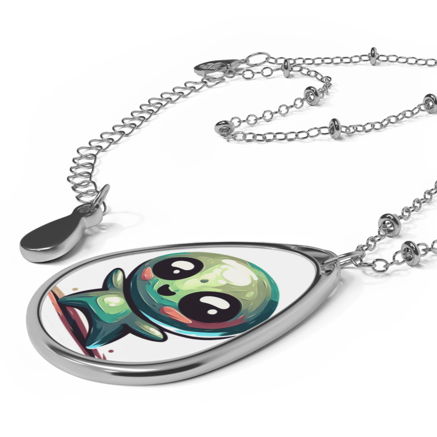 Whimsical Necklace featuring Aliens Need Hugs Too design, perfect for Sci-Fi lovers. Vibrant colors and glossy finish make it a stand-out accessory. Ideal for those who enjoy unique and quirky jewelry pieces. Great for science fiction enthusiasts.