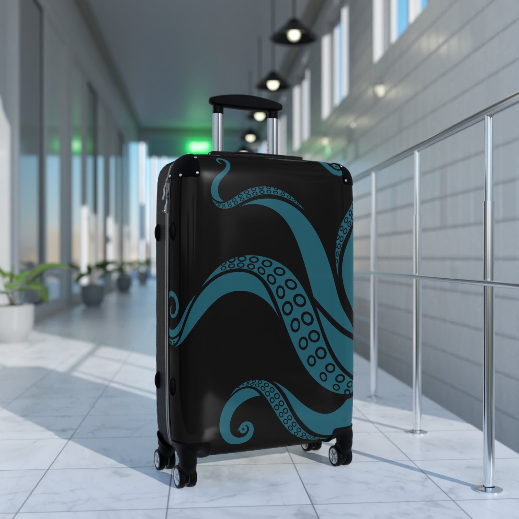 Durable suitcase with swivel wheels featuring teal kraken tentacle design on black shell, ideal for stylish ocean-themed travel.