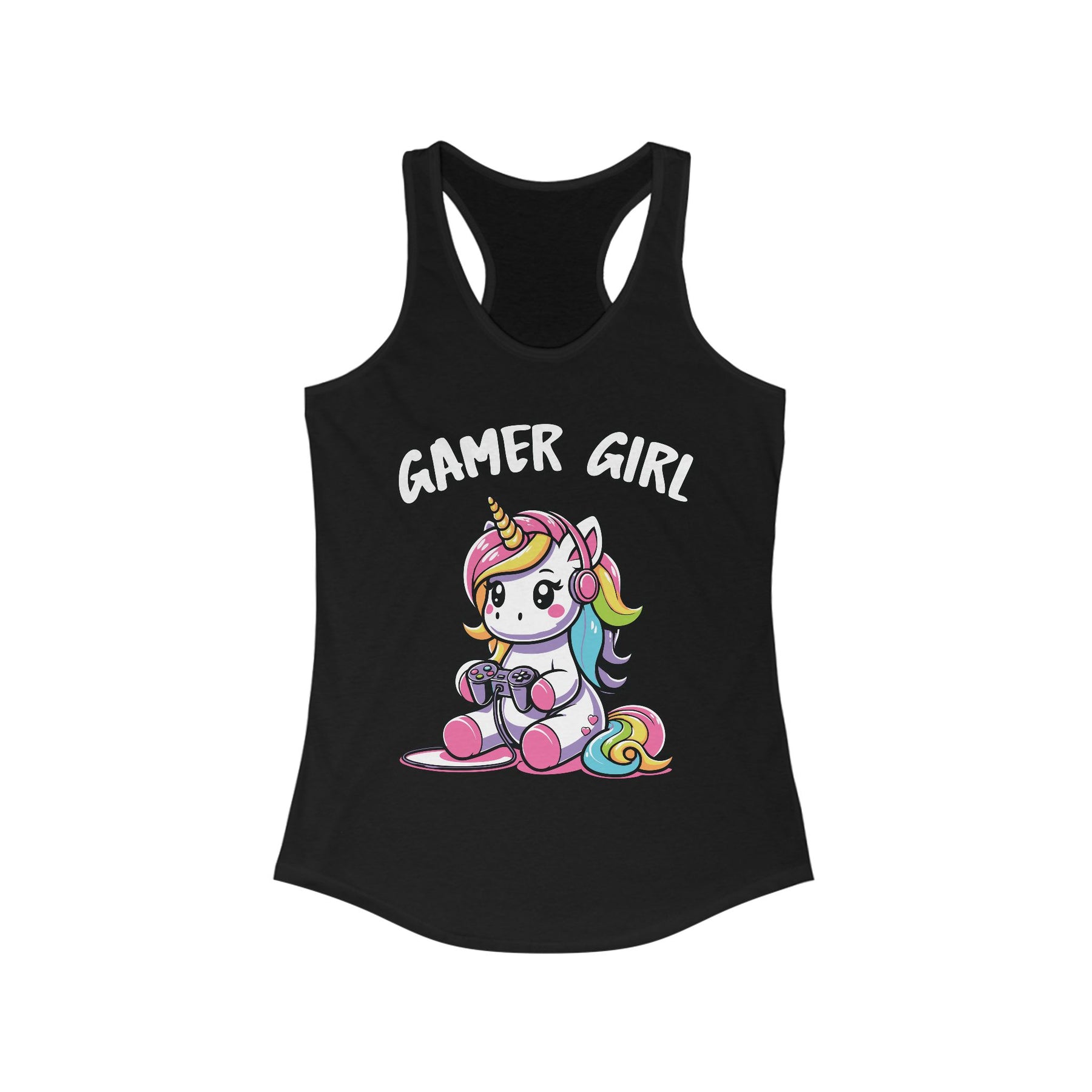Introducing the perfect addition to your wardrobe: a Women's Ideal Racerback Tank. This lightweight and stylish tank top embodies comfort and versatility, making it ideal for both active pursuits and casual outings. The fun design featuring a playful unicorn and the words "Gamer Girl" brings a vibrant and whimsical atmosphere to your outfit, perfect for expressing your personality while gaming or hanging out with friends.