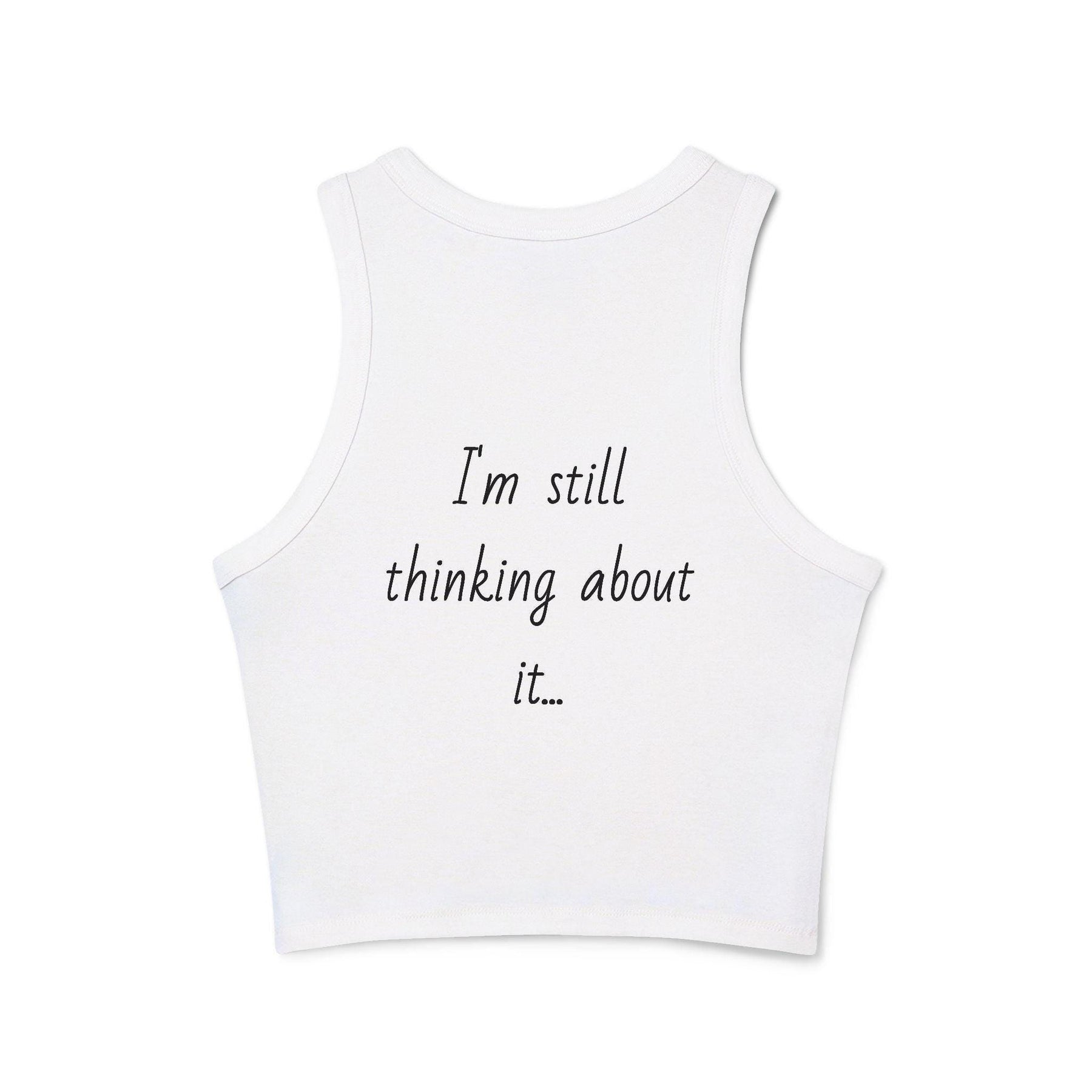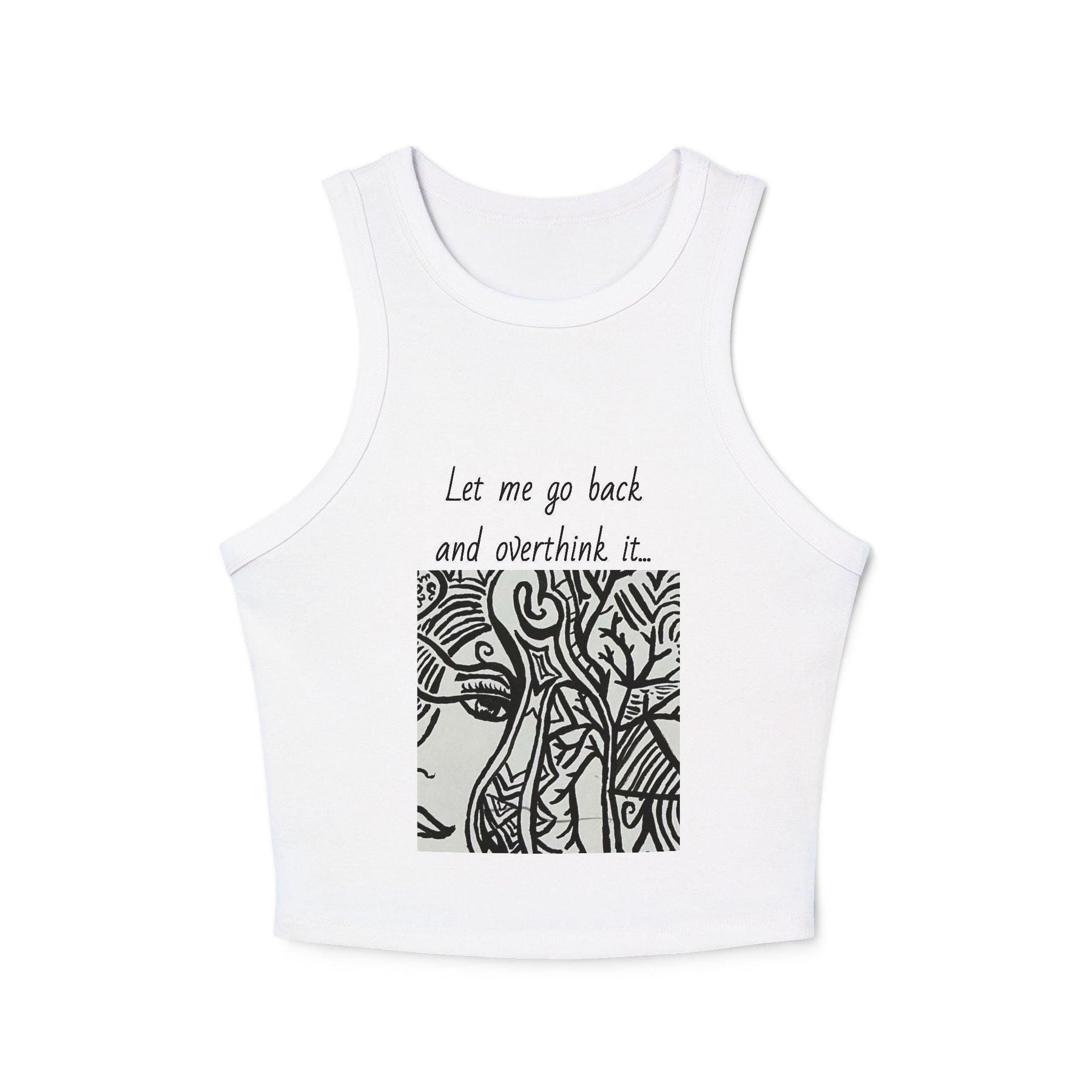 Looking for a tank top that shows off your brainy side? This racerback tank is for you. The clever "Overthinking" design highlights your tendency to overanalyze and allows you to wear your thinking habits on your sleeve - or rather, on your back. Slip it on to reveal to the world that your mind never stops working, even when you're relaxing. The simple yet striking graphic is sure to spark a conversation or two.(69 words)