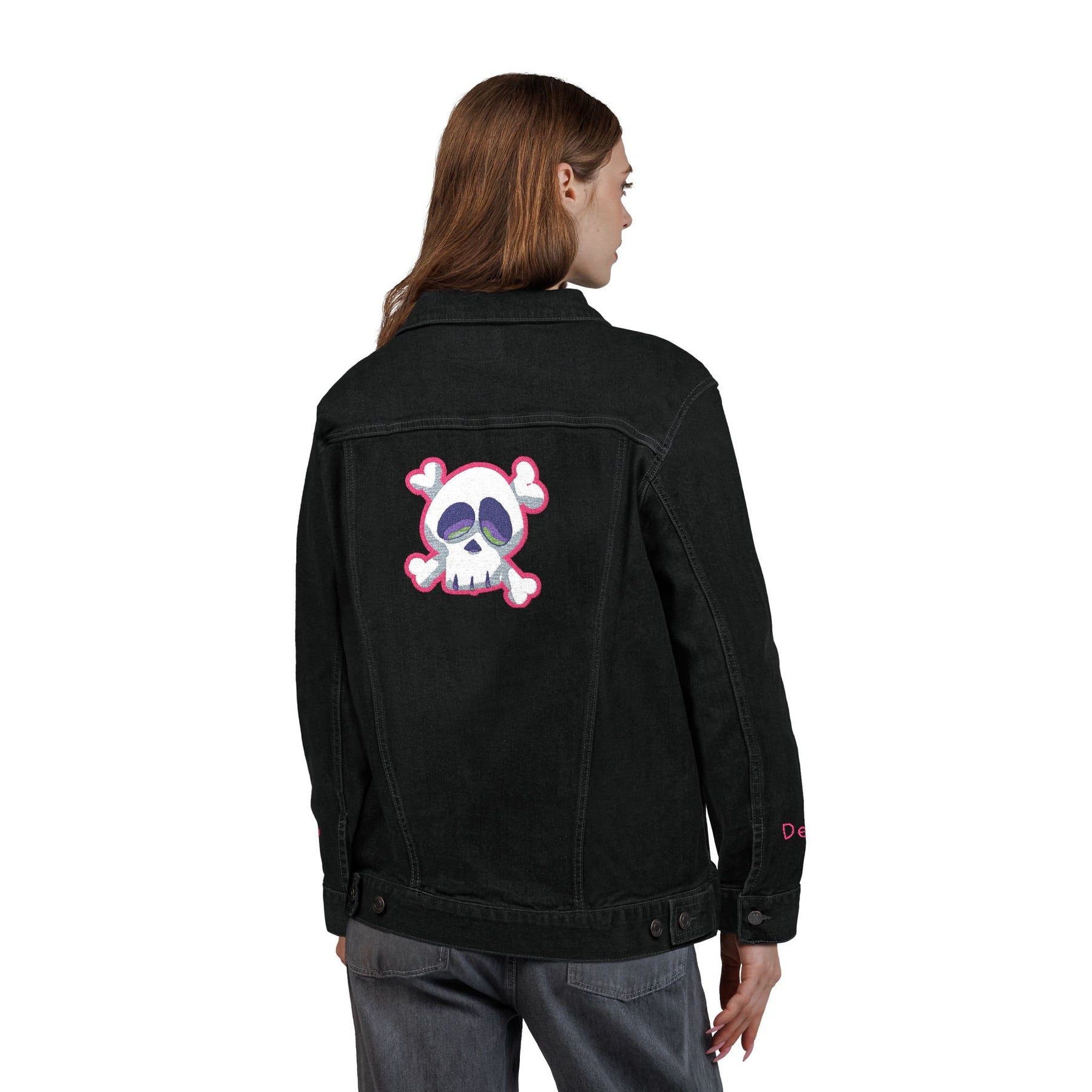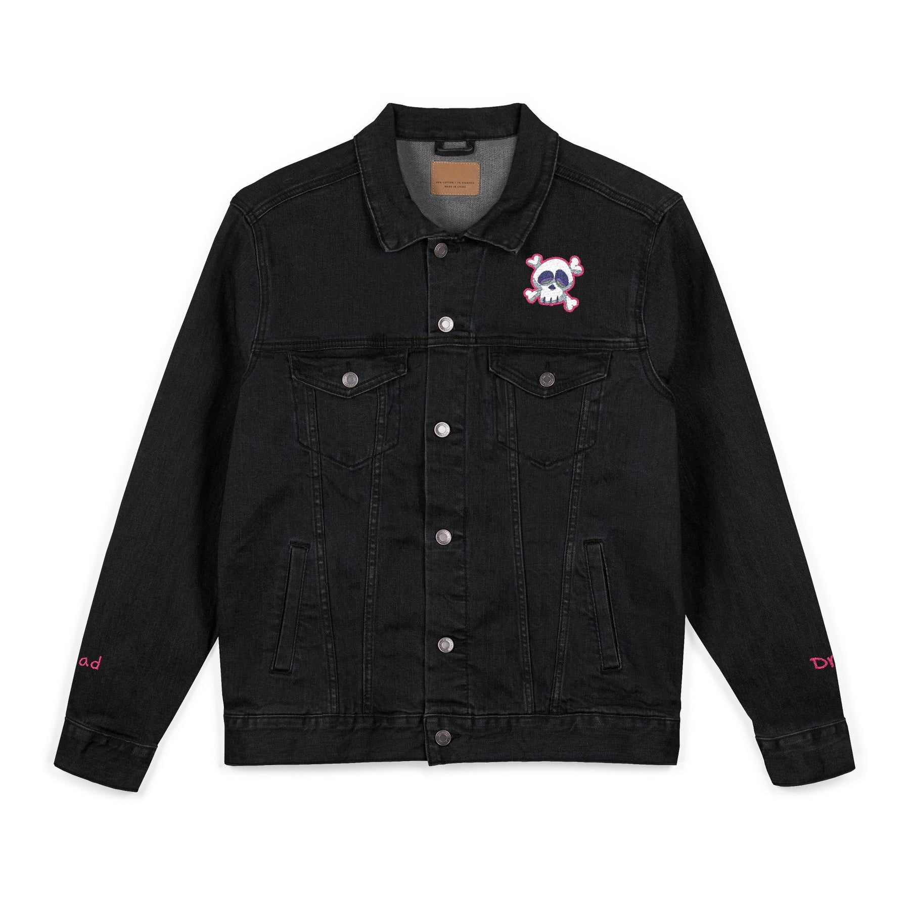 "Embroidered Drop Dead Pink Punk Skull Denim Jacket – edgy streetwear fashion for punk and rock lovers"
