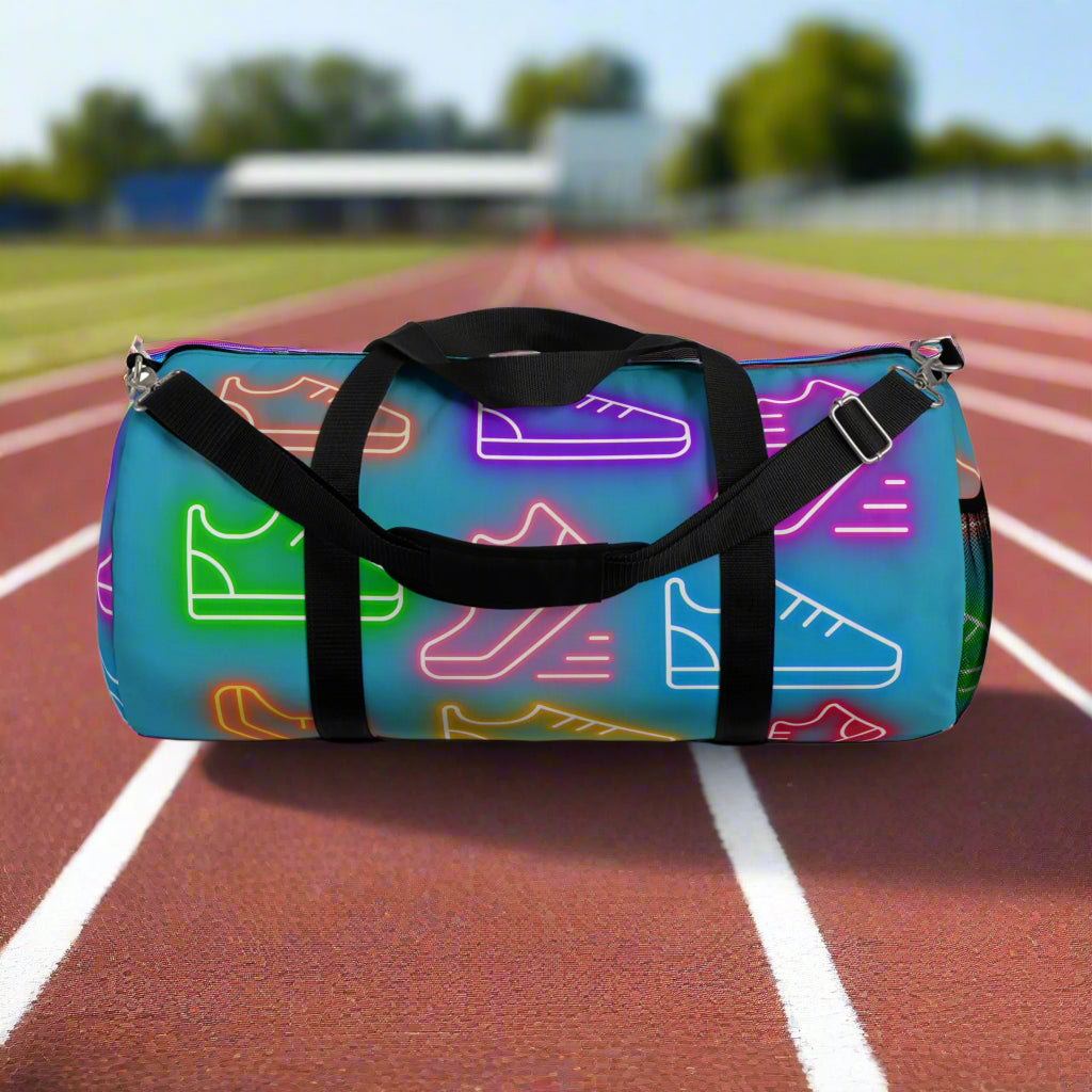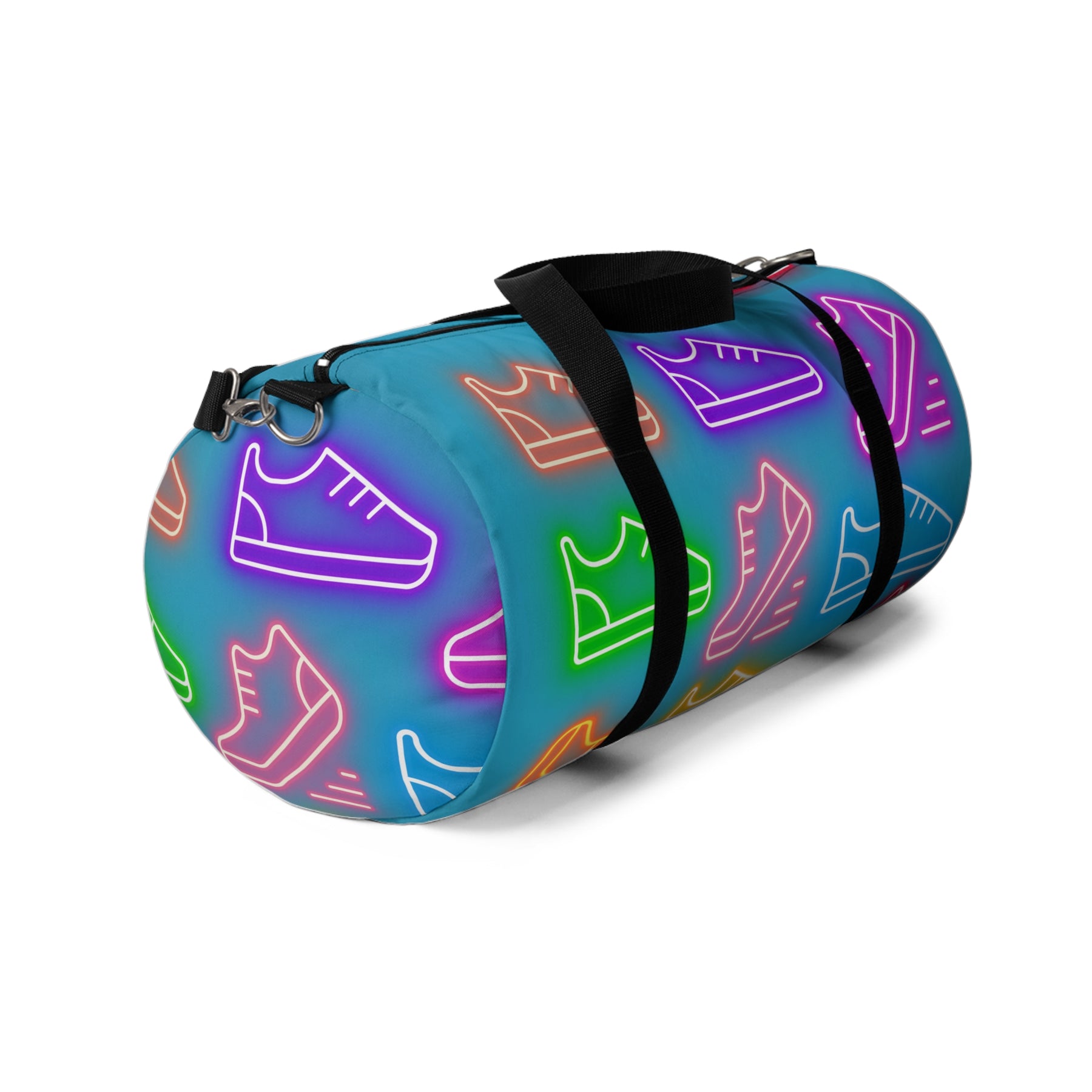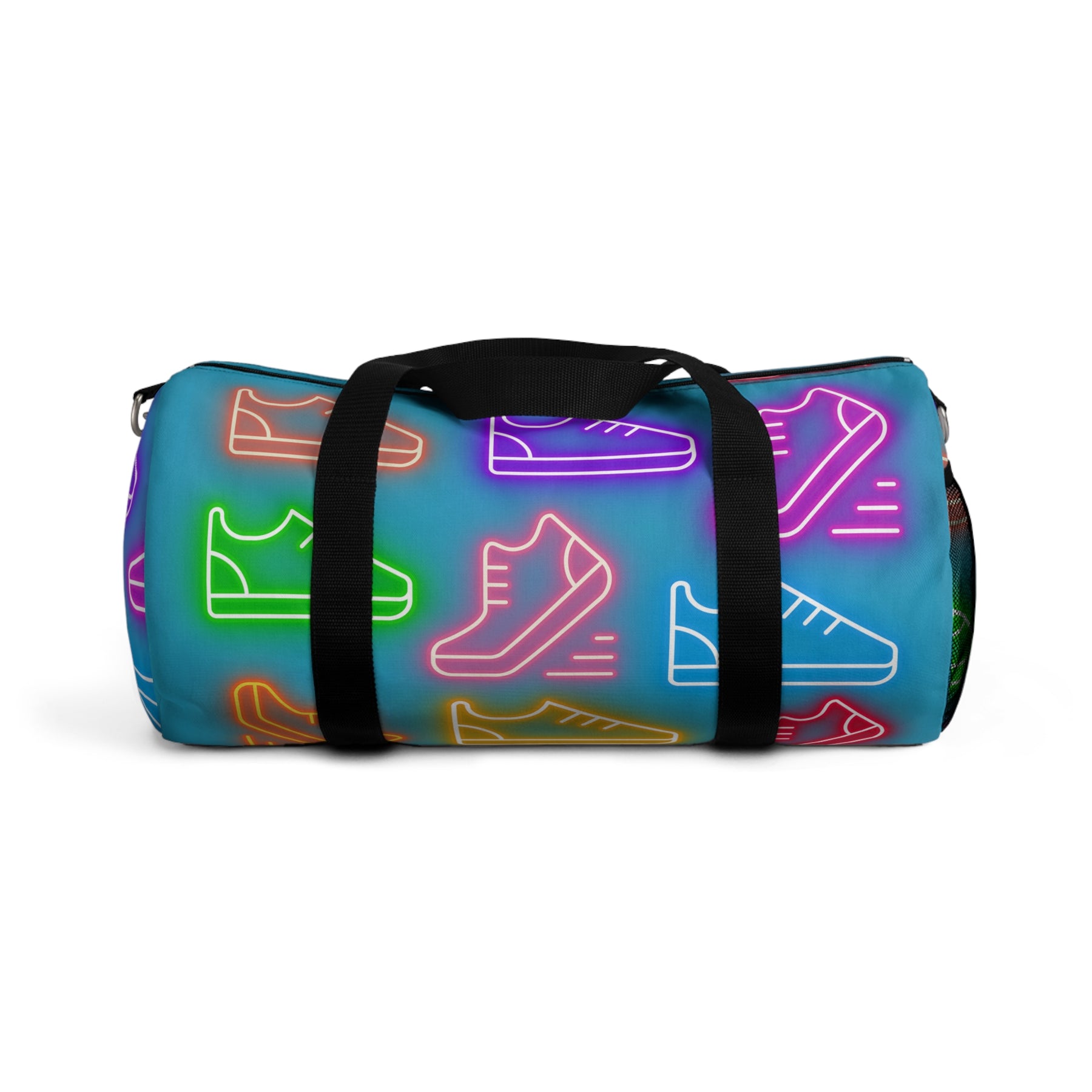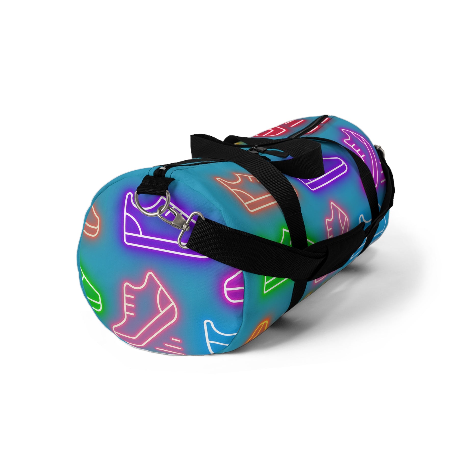 This stylish neon sneaker design duffel bag is perfect for runners and sneakerheads alike. It is giving retro vibes while maintaining a trendy modern feel. Carry your athletic endeavors proudly with this cool duffel.