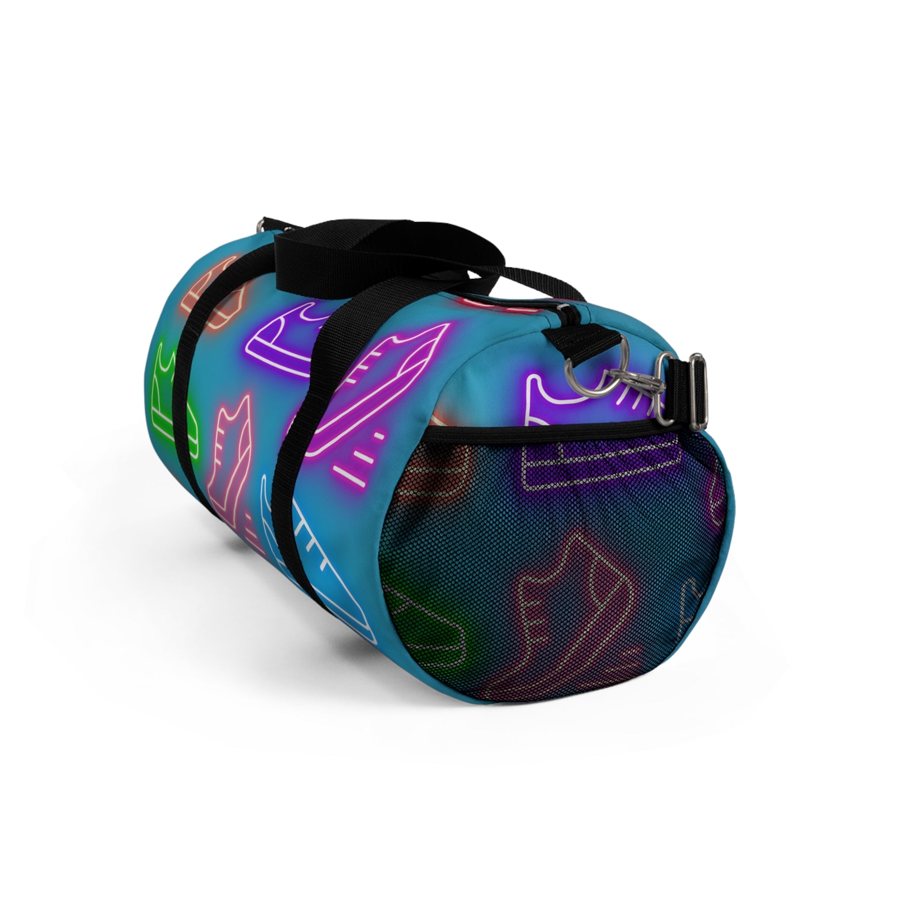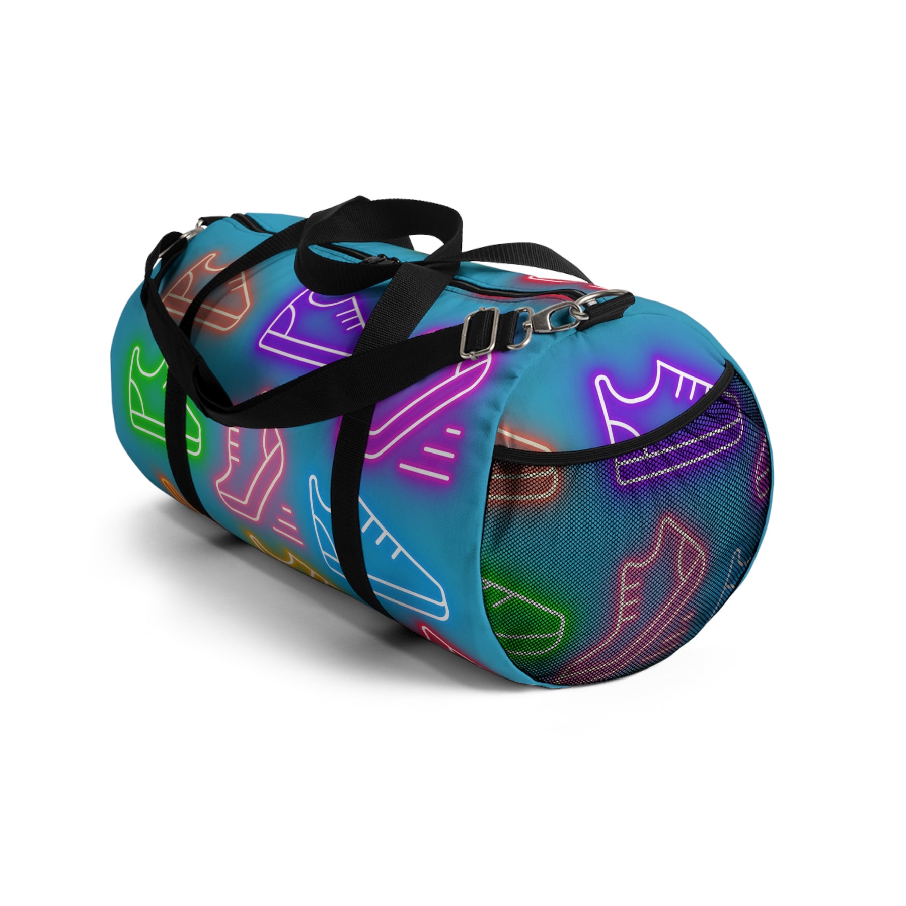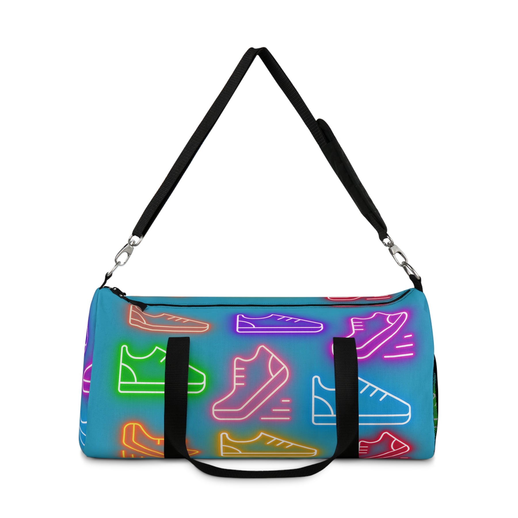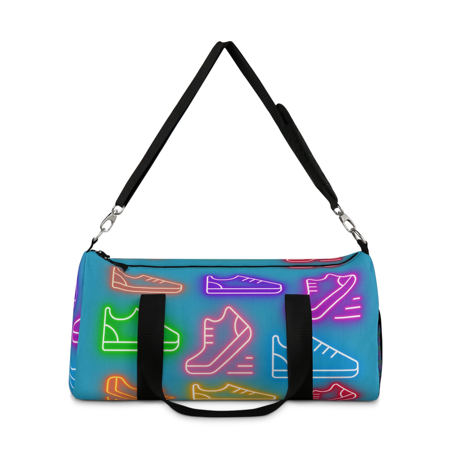 This stylish neon sneaker design duffel bag is perfect for runners and sneakerheads alike. It is giving retro vibes while maintaining a trendy modern feel. Carry your athletic endeavors proudly with this cool duffel.