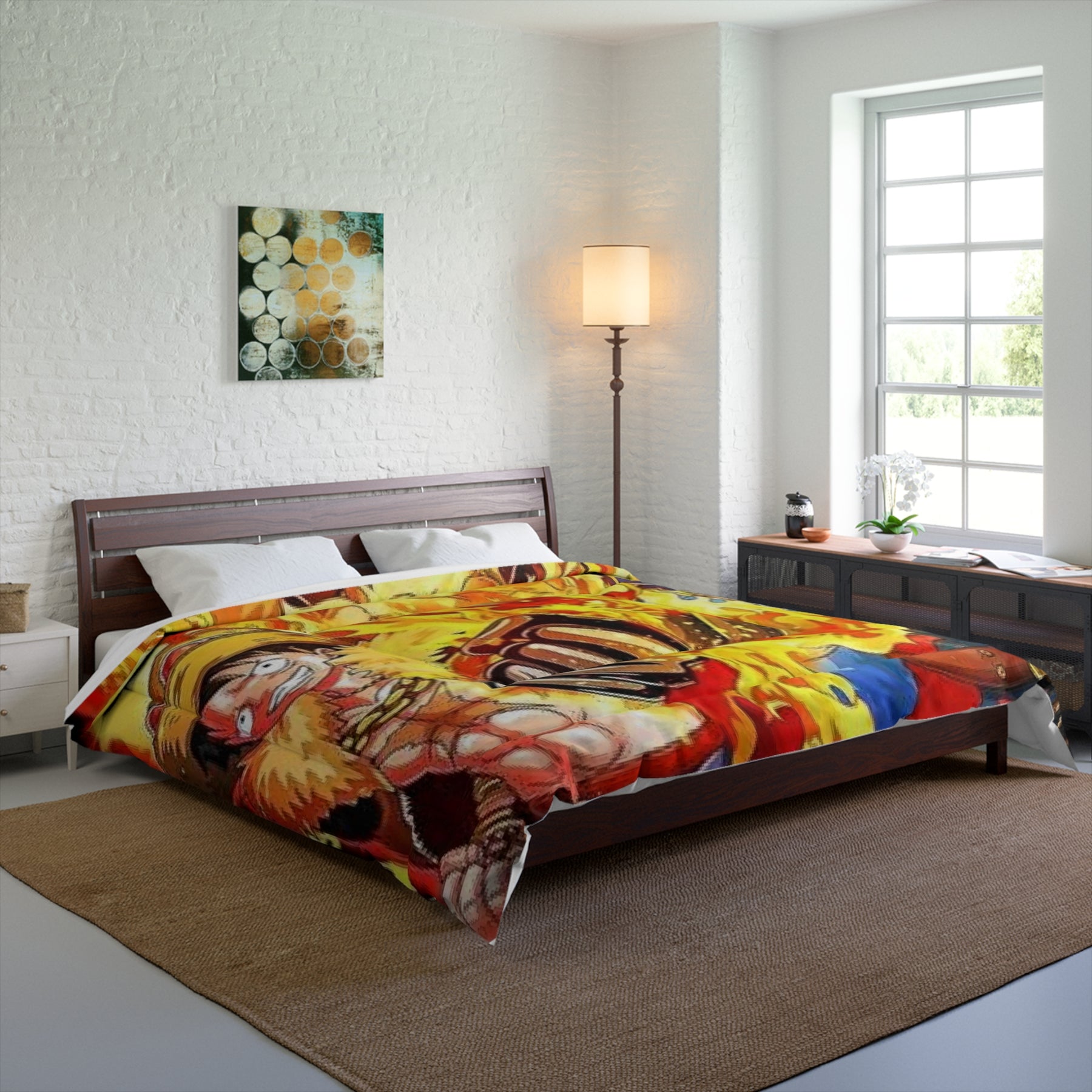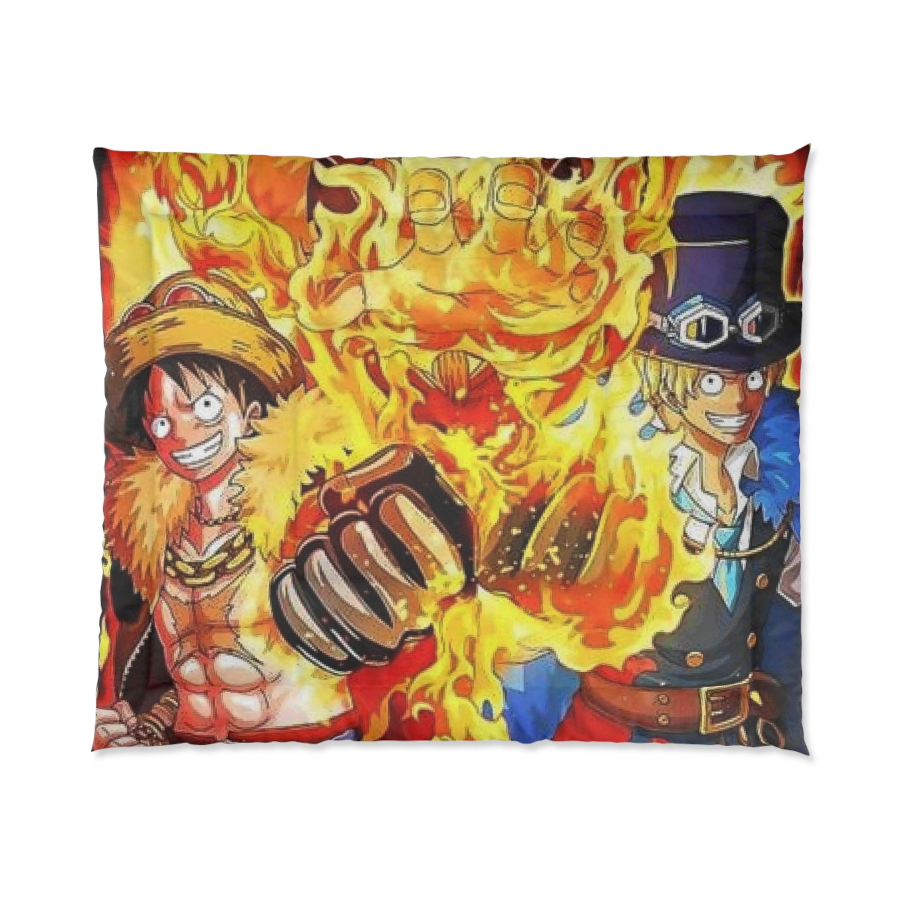 The sample shows two brothers Luffy and Sabo in flames of fire. Transform your bedroom into a vibrant sanctuary with this stunning comforter. Featuring dynamic artwork that bursts with energy, this piece is perfect for anyone looking to add a playful touch to their space. Its lightweight yet cozy material ensures comfort throughout all seasons, making it ideal for cozy nights and refreshing mornings alike. Whether you’re a fan of adventurous themes or simply want to express your unique style, this comforter fits seamlessly into your life. It's a great gift for teenagers and young adults, especially around birthdays, holidays, or even as a fresh back-to-school item!