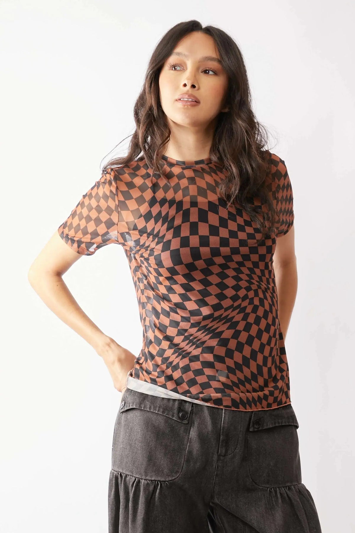 Davi & Dani Checker Board Printed Mesh Short Sleeve Top