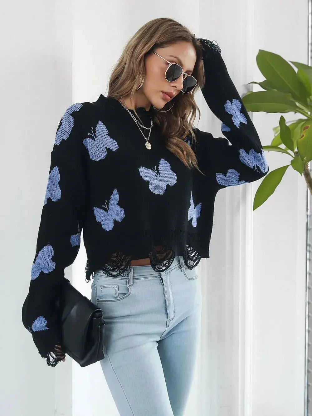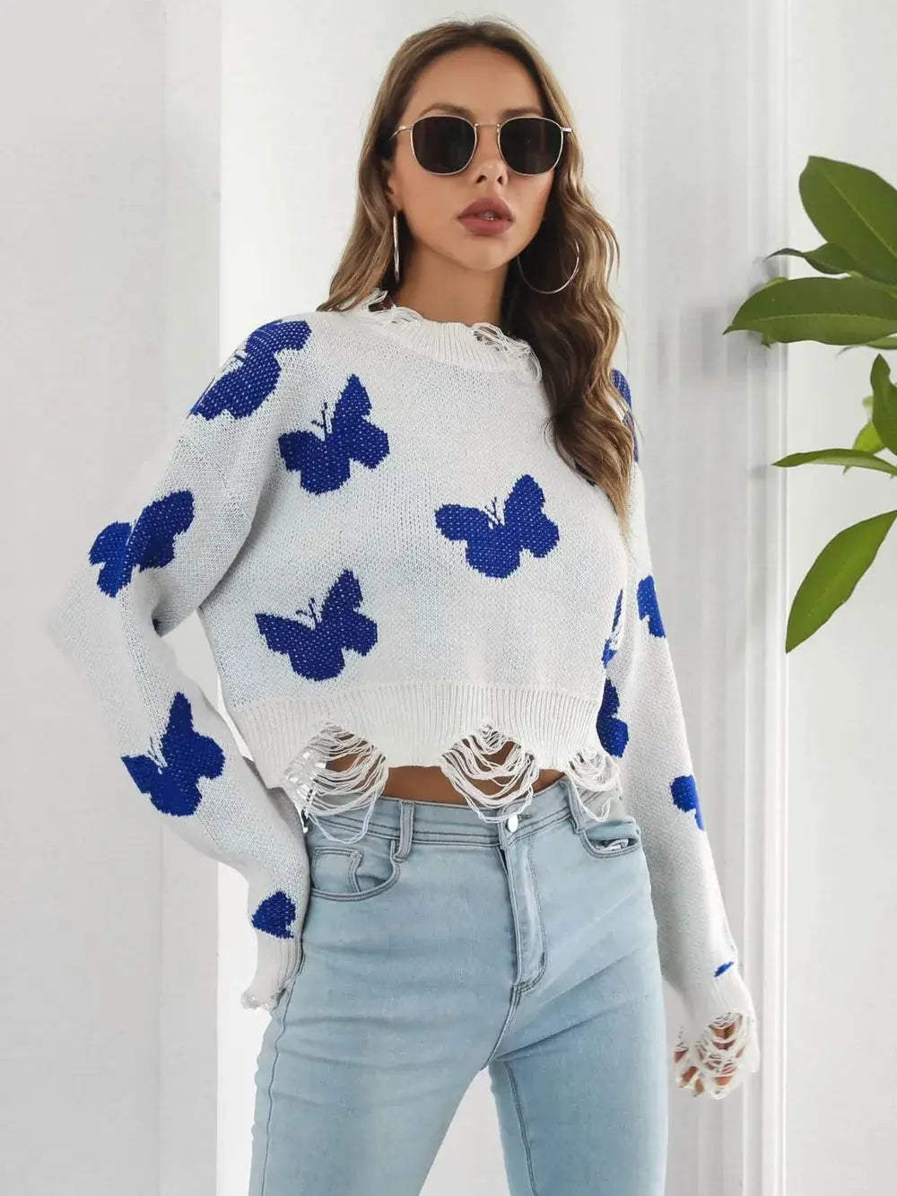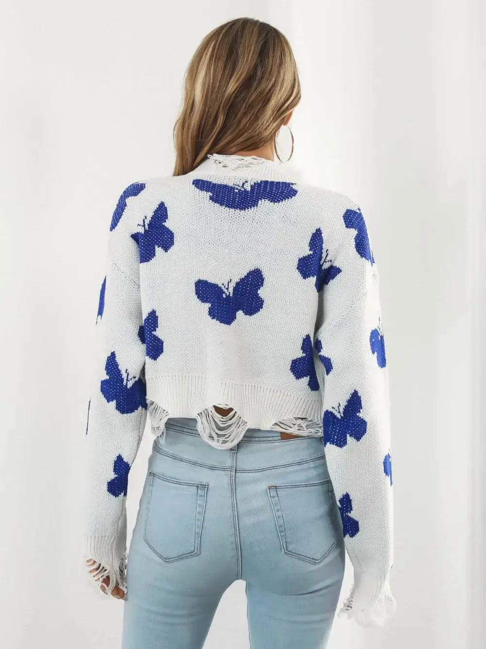 Distressed Butterfly Cropped Sweater