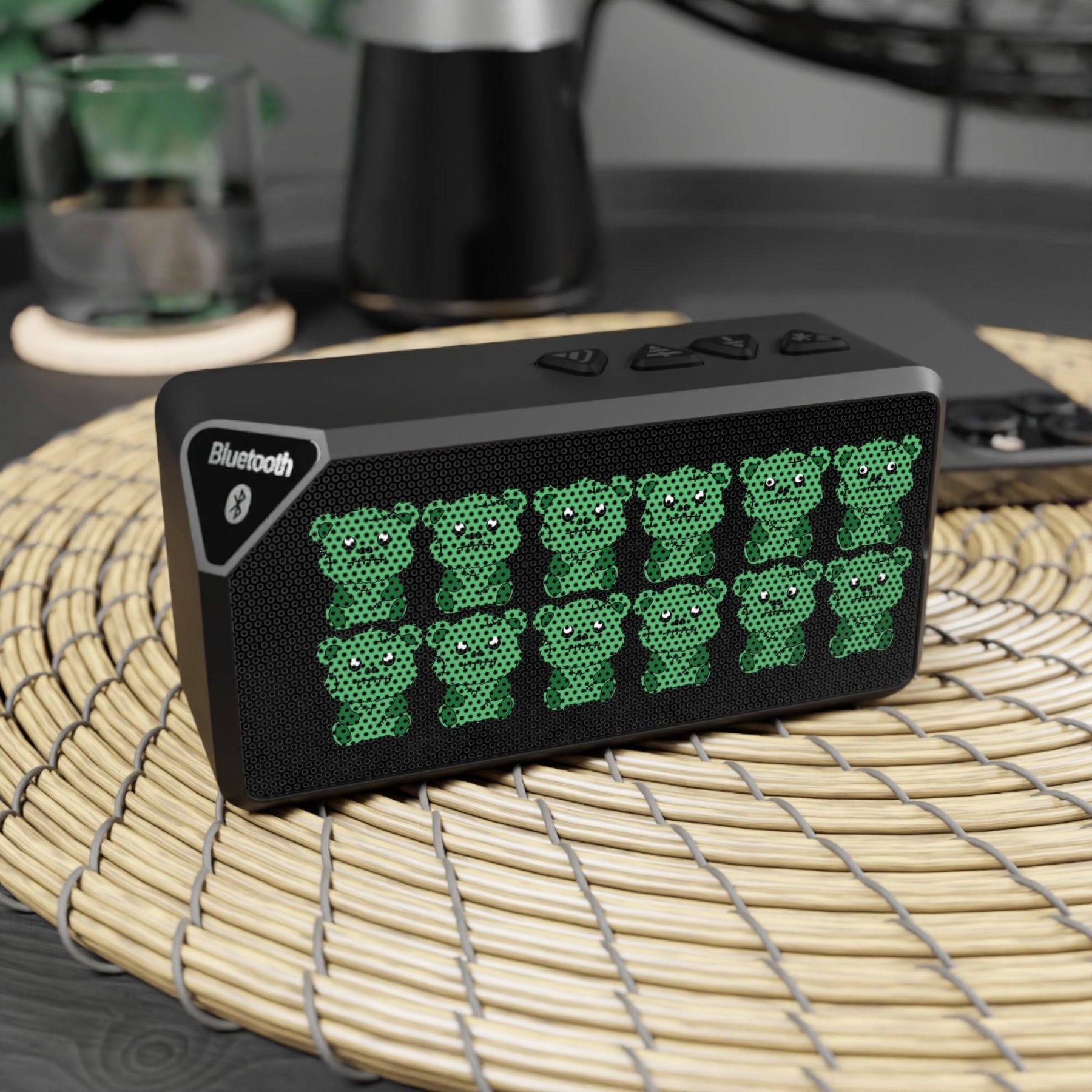 This is no ordinary bear - it's a gnarly green zombie beast that's here to shred some face-melting tunes. Introducing the Not a Carebear Stare Bluetooth speaker, a pop culture phenomenon that fuses the adorable squishiness of everyone's favorite stuffed animals with the gritty, punk rock attitude of the undead. Crank the volume and this little monster will unleash roars of rich, booming sound from its premium speaker blend that puts tinny phone speakers to shame. It's the ultimate nerdy accessory for setting the mood at your next horror movie marathon or adding some apocalyptic ambiance to your crypt. Just don't expect it to cuddle back - these zombie bears only have eyes for eardrum-rattling jams and cute countercultural chaos. Embrace your inner rebel and let this gnarly grizzly be the life of your twisted teddy bear picnic.