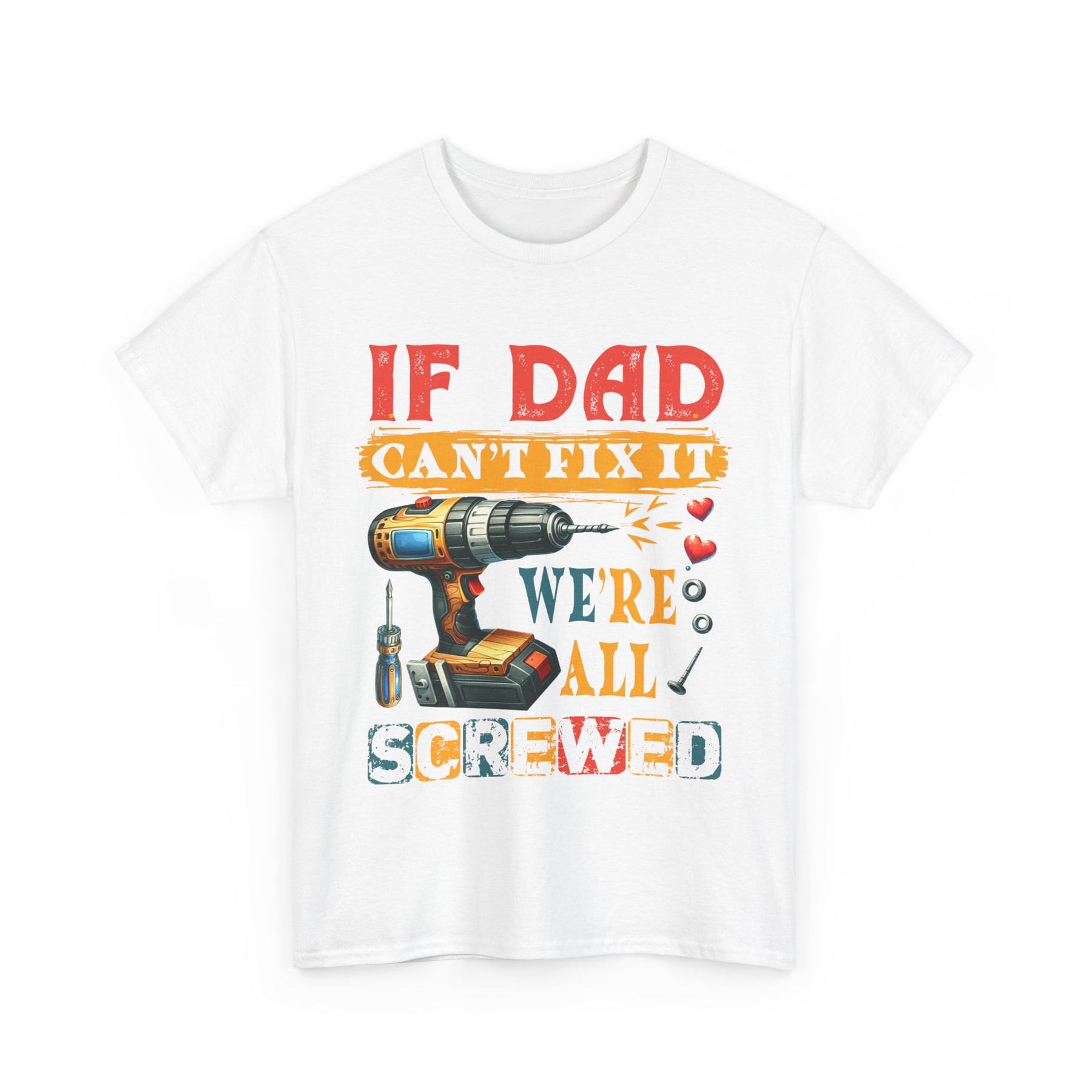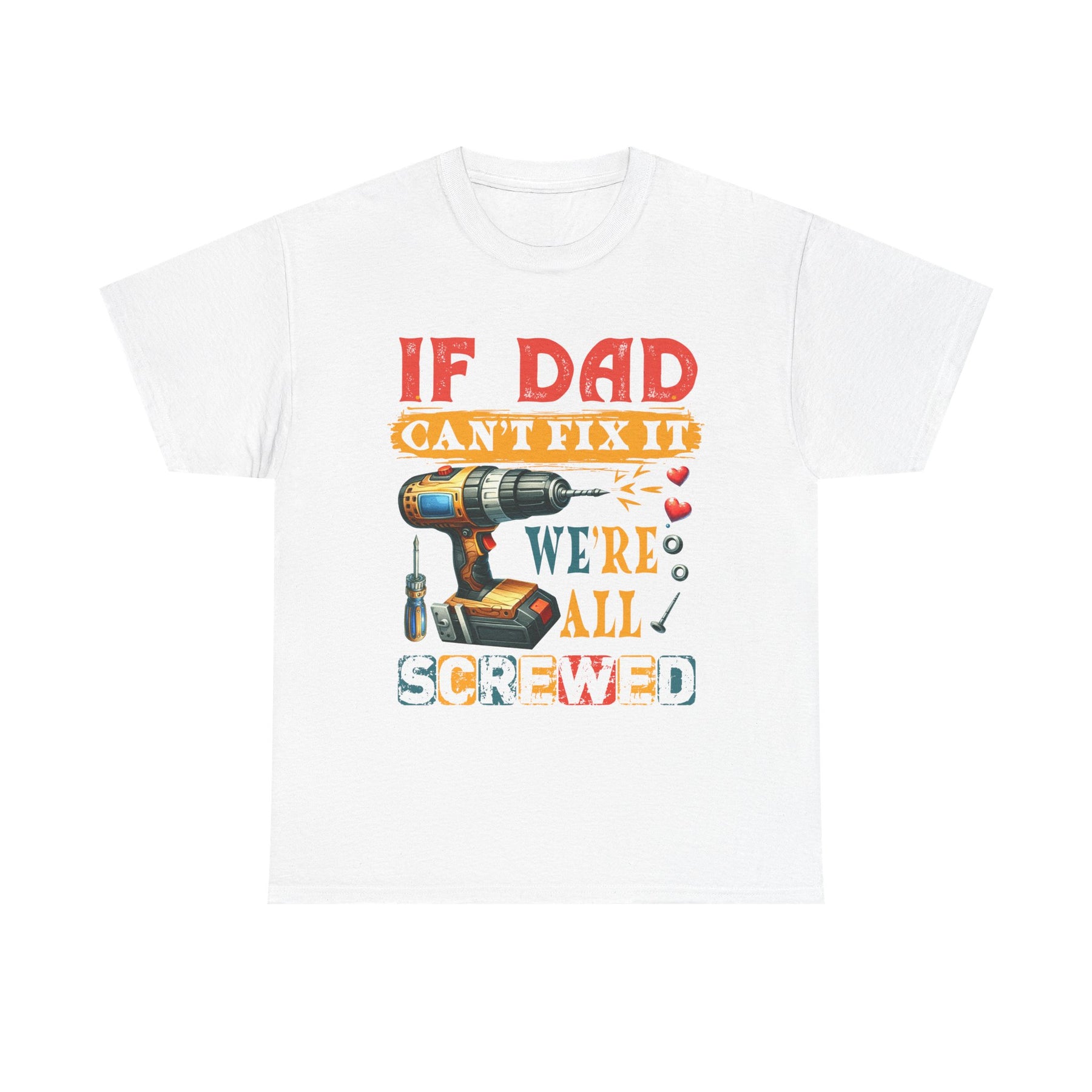 This T-Shirt with the humorous quote 'If Dad Can't Fix It We're All Screwed' is the perfect funny gift for Father's Day, give us a gift, or wear it yourselves as a fun surpise. Perfect for birthdays, or casual wear. It exudes a light-hearted vibe and is relevant to anyone with a sense of humor. The classic fit and comfy fabric make it a versatile piece for year-round wear.